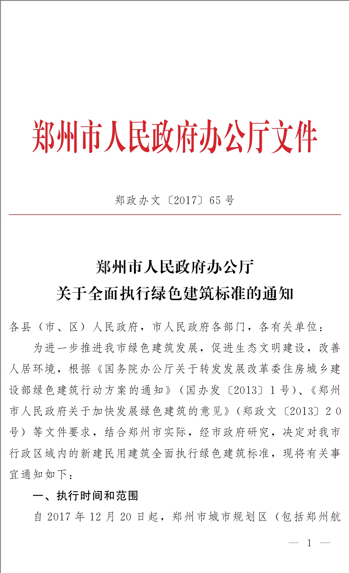 郑州市人民政府办公厅关于全面执行绿色建筑标准的通知